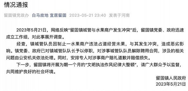城管與水果商戶(hù)沖突?河南留固鎮(zhèn):涉事城管隊(duì)隊(duì)長(zhǎng)停職、隊(duì)員解除合同