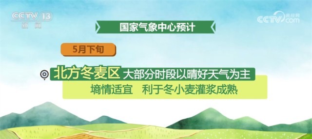 國家氣象中心預(yù)計(jì),5月下旬,北方冬麥區(qū)大部分時段以晴好天氣為主,墑情適宜,利于冬小麥灌漿成熟;江漢、江南及四川盆地、貴州等地有較強(qiáng)降雨,夏收作業(yè)將短暫受阻;江淮大部天氣較好,適宜夏收。