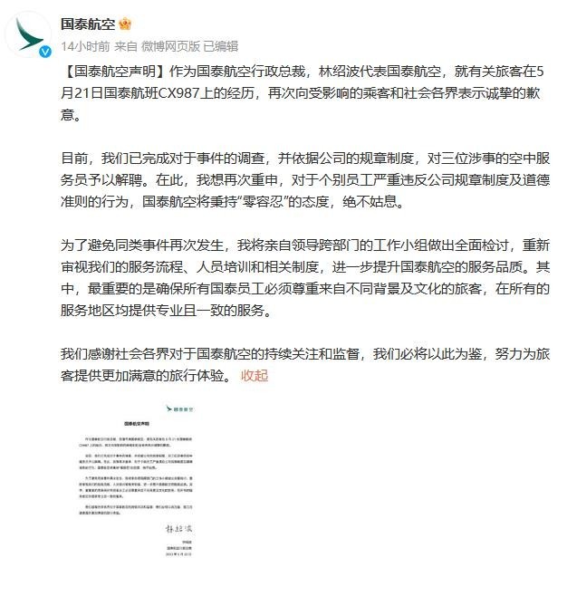 國(guó)泰航空三度致歉 解雇3名涉事乘務(wù)員
