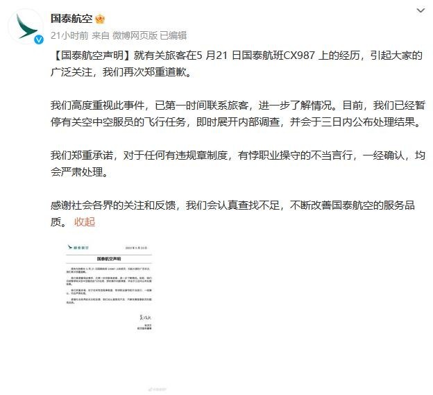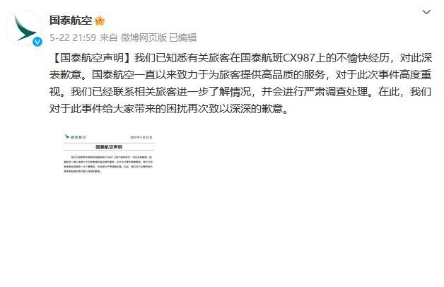 23日,國(guó)泰再次發(fā)聲明稱,已第一時(shí)間聯(lián)系旅客,目前已經(jīng)暫停有關(guān)乘務(wù)員的飛行任務(wù),即時(shí)展開(kāi)內(nèi)部調(diào)查,并會(huì)于三日內(nèi)公布處理結(jié)果。
