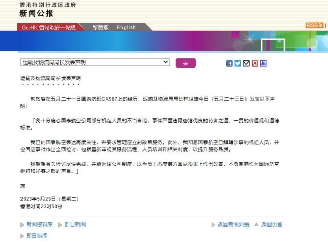 香港運(yùn)輸及物流局局長(zhǎng)林世雄23日晚間發(fā)布聲明表示,十分痛心國(guó)泰航空公司部分機(jī)組人員的不當(dāng)言論,事件嚴(yán)重違背香港優(yōu)良的待客之道、一貫的價(jià)值觀和道德標(biāo)準(zhǔn)。