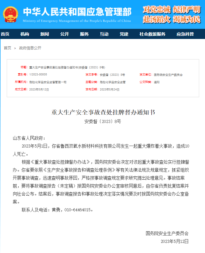 2023年5月1日,你省魯西雙氧水新材料科技有限公司發(fā)生一起重大爆炸著火事故,造成10人死亡。