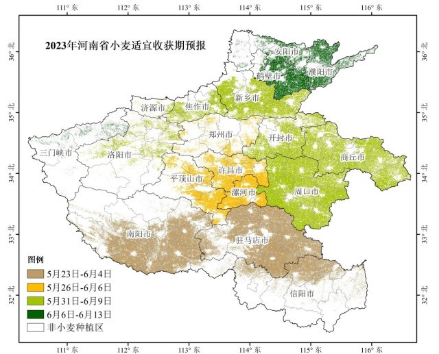 根據(jù)河南省氣象臺(tái)早前發(fā)布的消息,今年我省小麥適宜收獲期預(yù)計(jì)在5月23日-6月13日,大部地區(qū)接近常年,豫南地區(qū)略提前。其中:信陽(yáng)、南陽(yáng)、駐馬店適宜收獲期在5月23日-6月4日;漯河、平頂山、許昌、鄭州適宜收獲期在5月26日-6月6日;周口、商丘、開封、新鄉(xiāng)、焦作、洛陽(yáng)、濟(jì)源適宜收獲期在5月31日-6月9日;三門峽、鶴壁、濮陽(yáng)、安陽(yáng)適宜收獲期在6月6日-13日。