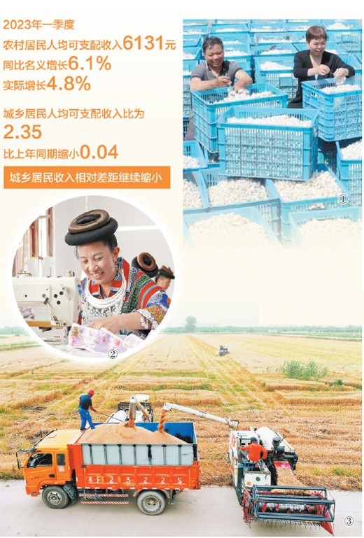 國家統(tǒng)計局發(fā)布的數(shù)據(jù)顯示,去年農村居民人均可支配收入首次邁上2萬元這個新臺階,城鄉(xiāng)居民收入相對差距持續(xù)縮小。今年一季度,農村居民人均可支配收入繼續(xù)保持增長勢頭,同比名義增長6.1%,實際增長4.8%,比去年全年提高0.6個百分點。