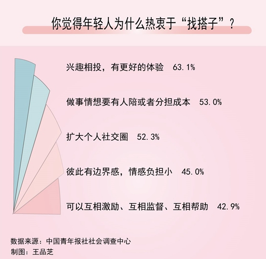 近日,中國青年報社社會調查中心聯(lián)合問卷網(wenjuan.com),對1335名受訪者進行的一項調查顯示,63.1%的受訪青年認為找“搭子”是因為興趣相投,有更好的體驗,53.0%的青年覺得是因為做事情想要有人陪或者分擔成本。
