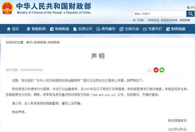 央視網(wǎng)消息:6月6日,財政部網(wǎng)站發(fā)布聲明,近期,有偽造的“中華人民共和國財政部金融債券”圖片及信息在社交媒體上傳播。現(xiàn)聲明如下: