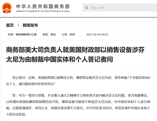 商務(wù)部美大司負(fù)責(zé)人就美國財政部以銷售設(shè)備涉芬太尼為由制裁中國實(shí)體和個人答記者問