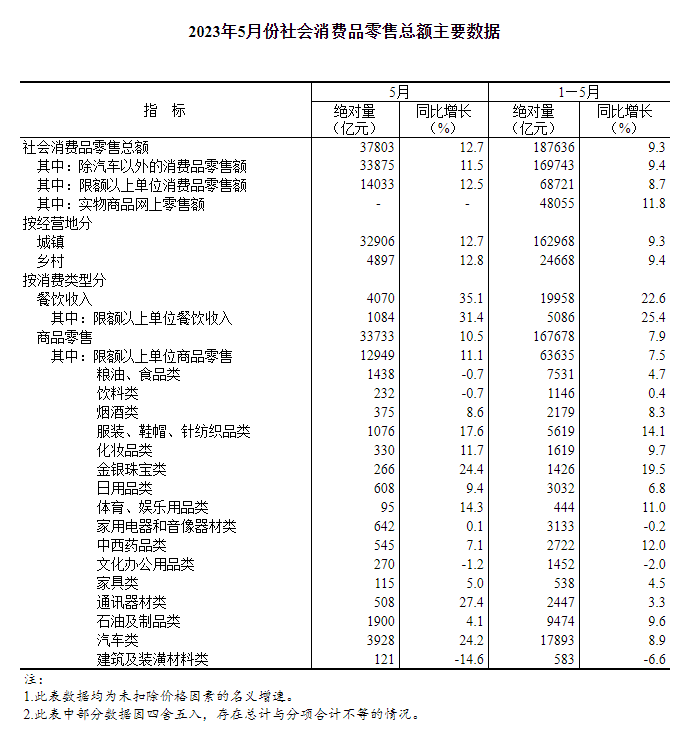國(guó)家統(tǒng)計(jì)局公布數(shù)據(jù),5月份,社會(huì)消費(fèi)品零售總額37803億元,同比增長(zhǎng)12.7%。其中,除汽車(chē)以外的消費(fèi)品零售額33875億元,增長(zhǎng)11.5%。