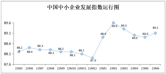 中國中小企業(yè)協(xié)會(huì)今天(10日)發(fā)布,隨著推動(dòng)經(jīng)濟(jì)回暖向好的政策措施持續(xù)發(fā)力生效,我國經(jīng)濟(jì)總體保持恢復(fù)態(tài)勢,中小企業(yè)發(fā)展指數(shù)止跌回升。6月中國中小企業(yè)發(fā)展指數(shù)(SMEDI)為89.1,比上月上升0.2點(diǎn),結(jié)束連續(xù)3個(gè)月下降態(tài)勢,且高于2022年同期水平。
