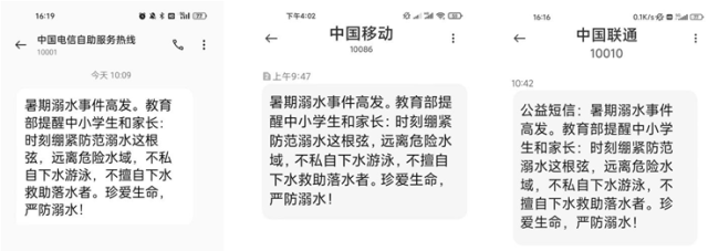 中國青年報客戶端北京7月13日電(中青報·中青網(wǎng)記者 樊未晨)記者今天從教育部獲悉,暑假來臨,教育部、工信部協(xié)調(diào)中國電信、中國移動、中國聯(lián)通三大運(yùn)營商,向全國手機(jī)用戶發(fā)送了暑期防溺水公益短信,提醒廣大中小學(xué)生和家長增強(qiáng)安全意識,營造全社會關(guān)心支持預(yù)防學(xué)生溺水工作良好氛圍。