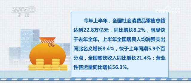 今年上半年,全國(guó)社會(huì)消費(fèi)品零售總額達(dá)到22.8萬(wàn)億元,同比增長(zhǎng)8.2%,明顯快于去年全年。上半年全國(guó)居民人均消費(fèi)支出同比名義增長(zhǎng)8.4%,快于上年同期5.9個(gè)百分點(diǎn),全國(guó)餐飲收入同比增長(zhǎng)21.4%;營(yíng)業(yè)性客運(yùn)量同比增長(zhǎng)56.3%。