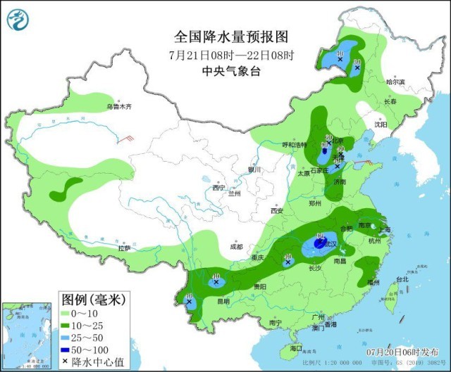 圖1 全國降水量預(yù)報圖(7月20日08時-21日08時)