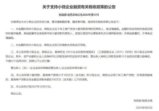 一、對(duì)金融機(jī)構(gòu)向小型企業(yè)、微型企業(yè)及個(gè)體工商戶發(fā)放小額貸款取得的利息收入,免征增值稅。金融機(jī)構(gòu)應(yīng)將相關(guān)免稅證明材料留存?zhèn)洳椋瑔为?dú)核算符合免稅條件的小額貸款利息收入,按現(xiàn)行規(guī)定向主管稅務(wù)機(jī)關(guān)辦理納稅申報(bào);未單獨(dú)核算的,不得免征增值稅。