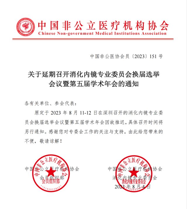消化內(nèi)鏡專業(yè)委員會換屆選舉會議暨第五屆學術年會延期通知。圖片來源:中國非公立醫(yī)療機構協(xié)會