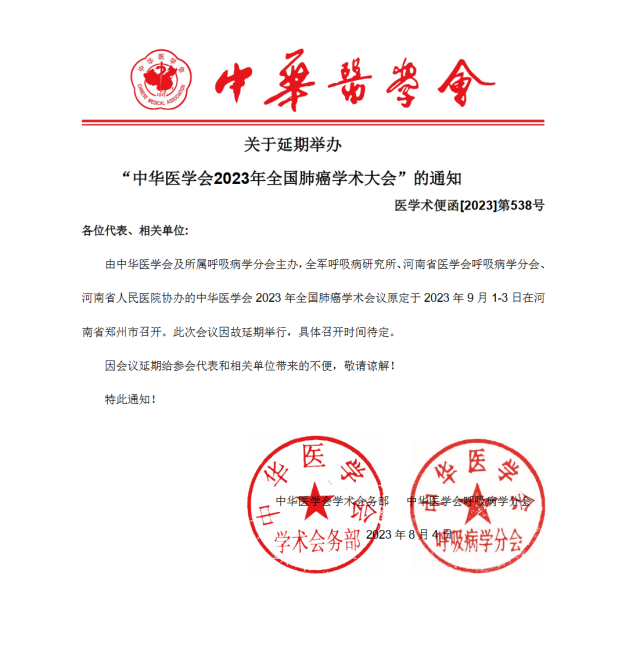 8月4日,中華醫(yī)學會2023年全國肺癌學術會議原定于2023年9月1-3日在河南省鄭州市召開,因故延期舉行,具體召開時間待定。