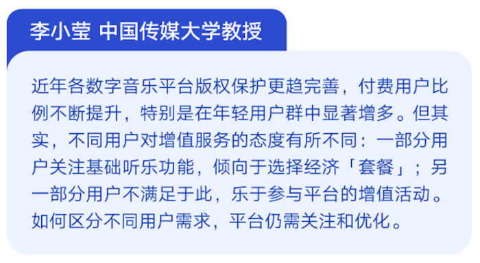 “近年各數(shù)字音樂平臺版權保護更趨完善,付費用戶比例不斷提升,特別是在年輕用戶群中顯著增多”,中國傳媒大學教授李小瑩指出,不同用戶對增值服務的態(tài)度有所不同:一部分用戶關注基礎聽樂功能,傾向于選擇經(jīng)濟“套餐”;另一部分用戶不滿足于此,樂于參與平臺的增值活動。