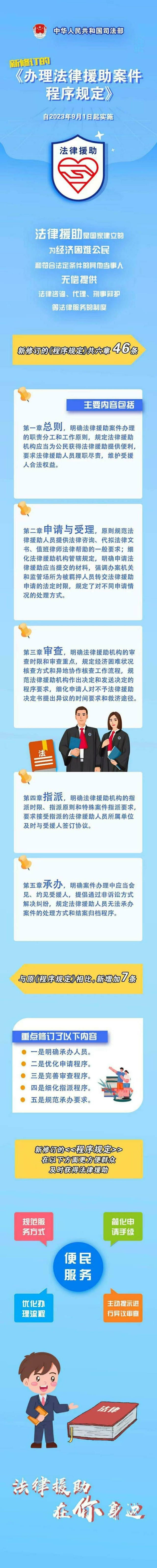 為貫徹落實法律援助法,提高法律援助案件辦理程序的標準化規(guī)范化水平,司法部對2012年公布并施行的《辦理法律援助案件程序規(guī)定》進行了全面修訂,修訂后的《程序規(guī)定》,在方便群眾及時獲得法律援助、提高法律援助服務質(zhì)量等方面,作出了一系列具體規(guī)定?!冻绦蛞?guī)定》自2023年9月1日起施行。
