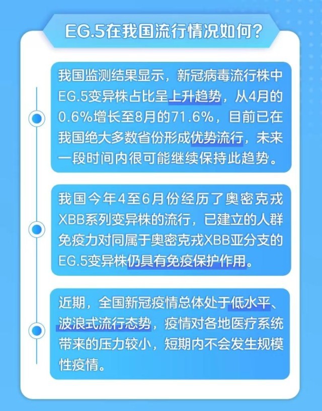 部分公眾關(guān)心EG.5是否會引發(fā)新一輪的廣泛流行。對此,國家疾控局表示,我國今年4至6月份經(jīng)歷了奧密克戎XBB系列變異株的流行,已建立的人群免疫力對同屬于奧密克戎XBB亞分支的EG.5變異株仍具有免疫保護作用,短期內(nèi)不會發(fā)生規(guī)模性疫情。