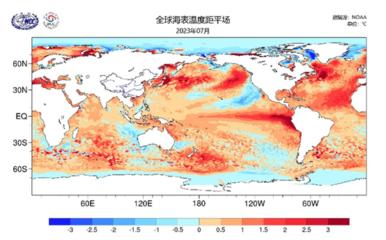 海洋監(jiān)測方面,2023年7月,赤道太平洋大部海表溫度(SST)較常年同期偏高,東太平洋暖水中心偏高2.0℃以上。Ni?o3.4區(qū)海溫指數(shù)為1.11℃,較上月上升0.18℃,最近3個月(5月至7月)指數(shù)滑動平均值為0.84℃。監(jiān)測數(shù)據(jù)表明,目前赤道中東太平洋維持厄爾尼諾狀態(tài)。