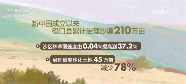 數(shù)據(jù)顯示,新中國成立以來,磴口縣累計治理沙漠210萬畝,沙區(qū)林草覆蓋度由0.04%提高到37.2%,治理重度沙化土地45萬畝,減少78%,向黃河年輸沙量減少到370萬噸,降低94.7%,沙漠治理呈現(xiàn)出“整體好轉(zhuǎn)、改善加速”的良好態(tài)勢,也因此形成了防沙治沙“磴口模式”。