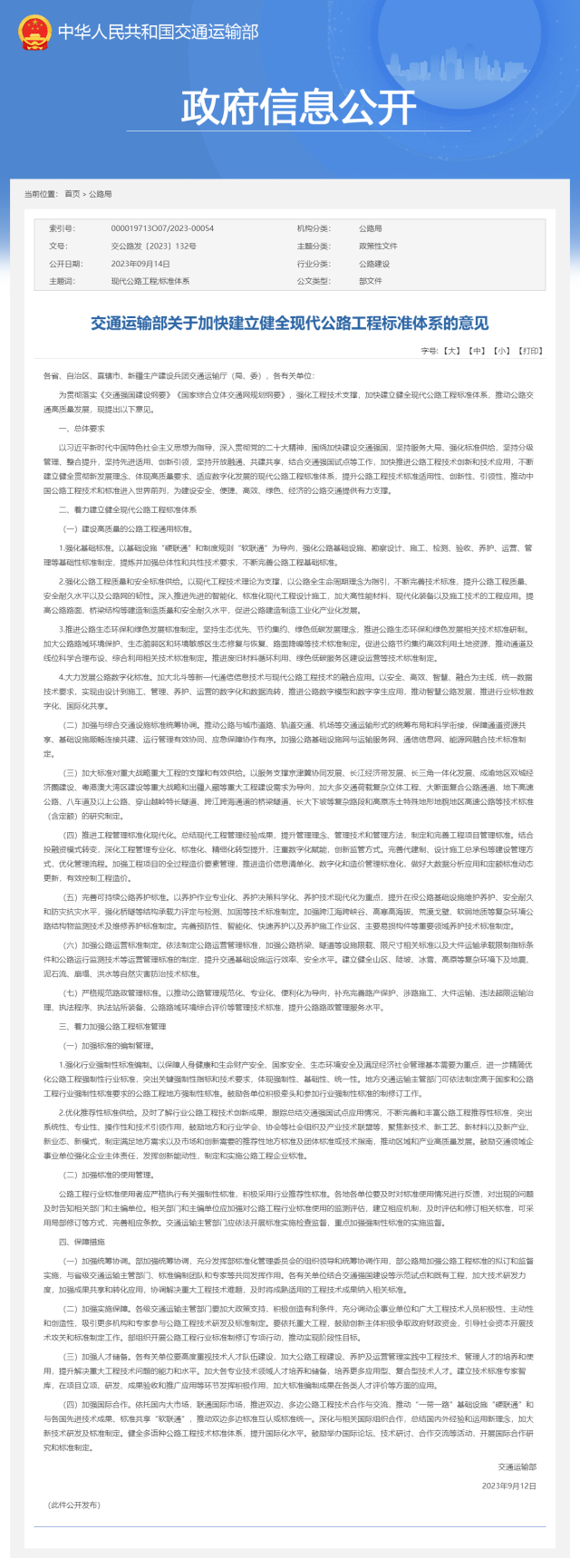 央視網(wǎng)消息:交通運(yùn)輸部發(fā)布關(guān)于加快建立健全現(xiàn)代公路工程標(biāo)準(zhǔn)體系的意見。其中提出,大力發(fā)展公路數(shù)字化標(biāo)準(zhǔn)。加大北斗等新一代通信信息技術(shù)與現(xiàn)代公路工程技術(shù)的融合應(yīng)用。以安全、高效、智慧、融合為主線,統(tǒng)一數(shù)據(jù)技術(shù)要求,實(shí)現(xiàn)由設(shè)計(jì)到施工、管理、養(yǎng)護(hù)、運(yùn)營(yíng)的數(shù)字化和數(shù)據(jù)流轉(zhuǎn),推進(jìn)公路數(shù)字模型和數(shù)字孿生應(yīng)用,推動(dòng)智慧公路發(fā)展,推進(jìn)行業(yè)標(biāo)準(zhǔn)數(shù)字化、國(guó)際化共享。