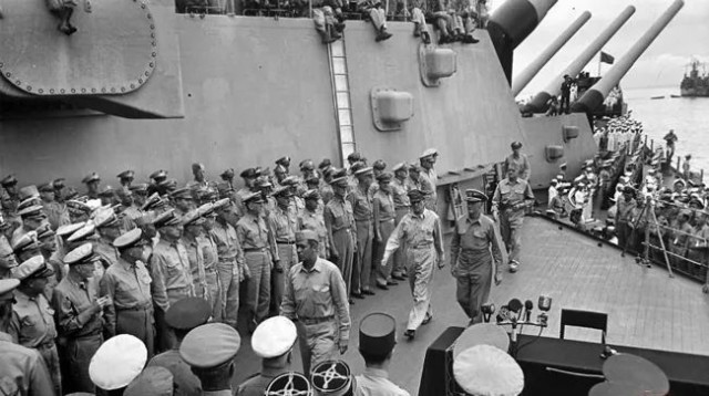 停泊于東京灣的美國戰(zhàn)列艦“密蘇里”號(hào)上舉行向同盟國投降的簽降儀式