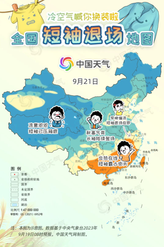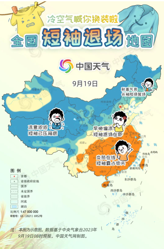 進入9月中旬,冷空氣變“勞模”頻繁來襲,西北、東北大部都已邁入秋天門檻,但華北一帶今年秋天似乎來得有點兒晚,南方地區(qū)白天甚至熱到還要開空調(diào),不少網(wǎng)友喊話:“秋高氣爽何時能來?”9月19日至21日,受冷空氣和降雨共同影響,長江以北大部地區(qū)將陸續(xù)迎來降溫,開啟秋日初體驗。中國天氣網(wǎng)特別推出全國短袖退場地圖,看看哪里可以安排秋天的第一件長袖。