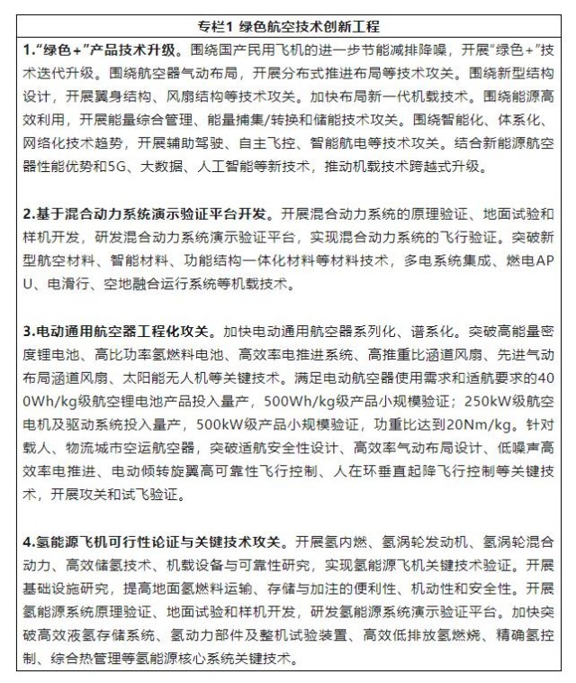 1.強(qiáng)化綠色航空關(guān)鍵核心技術(shù)攻關(guān)。持續(xù)推動(dòng)總體、氣動(dòng)、結(jié)構(gòu)、發(fā)動(dòng)機(jī)、機(jī)載、材料、制造工藝等領(lǐng)域技術(shù)升級換代,加速發(fā)展混合動(dòng)力推進(jìn)系統(tǒng),不斷提升干支線飛機(jī)、通用航空器節(jié)能減排降噪水平。加快發(fā)展高能量密度、高放電效率、高安全性的航空動(dòng)力電池技術(shù),以及高可靠性、高功重比、高效率的航空電推進(jìn)技術(shù)。加強(qiáng)高效燃?xì)鉁u輪-電能融合技術(shù)研究。引導(dǎo)優(yōu)勢企業(yè)和研究機(jī)構(gòu)持續(xù)突破智能化、高可靠性、輕量化、低成本能量控制和飛行控制技術(shù),開展新能源飛機(jī)總體設(shè)計(jì)、能源系統(tǒng)設(shè)計(jì)、全電機(jī)載系統(tǒng)等技術(shù)攻關(guān)。持續(xù)探索氫燃料存儲技術(shù)、氫燃料電池技術(shù)、氫內(nèi)燃、氫渦輪發(fā)動(dòng)機(jī)技術(shù)、氫渦輪混合電推進(jìn)技術(shù)、能量綜合管理技術(shù)等氫能源飛機(jī)關(guān)鍵技術(shù)。面向國家綠色航空發(fā)展的戰(zhàn)略需要,加快布局基礎(chǔ)研究和應(yīng)用基礎(chǔ)研究,解決制約綠色航空發(fā)展的源頭和底層技術(shù)問題。