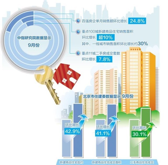 隨著需求釋放動能減弱,9月后兩周成交量明顯下降。北京市住建委數(shù)據(jù)顯示,9月份,北京新建商品住宅簽約5891套,成交面積67.96萬平方米,環(huán)比分別增長42.9%和41.1%;二手商品住宅成交14262套,環(huán)比增長30.1%。