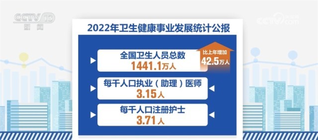 《公報(bào)》顯示,我國醫(yī)療衛(wèi)生資源總量繼續(xù)增加。到2022年末,全國醫(yī)療衛(wèi)生機(jī)構(gòu)達(dá)到1032918個(gè),比上年增加1983個(gè)。全國共設(shè)置13個(gè)類別的國家醫(yī)學(xué)中心和兒童類別的國家區(qū)域醫(yī)療中心。全國醫(yī)療衛(wèi)生機(jī)構(gòu)床位975.0萬張,每千人口醫(yī)療衛(wèi)生機(jī)構(gòu)床位數(shù)由2021年的6.70張?jiān)黾拥?022年的6.92張。全國衛(wèi)生人員總數(shù)1441.1萬人,比上年增加42.5萬人。每千人口執(zhí)業(yè)(助理)醫(yī)師3.15人,每千人口注冊護(hù)士3.71人。
