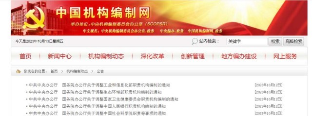 中國機(jī)構(gòu)編制網(wǎng)12日消息,中共中央辦公廳、國務(wù)院辦公廳日前發(fā)布相關(guān)通知,調(diào)整工業(yè)和信息化部、生態(tài)環(huán)境部、國家衛(wèi)生健康委員會、中國人民銀行職責(zé)機(jī)構(gòu)編制,調(diào)整中國社會科學(xué)院職責(zé)等事項。