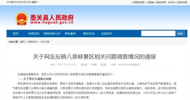 據壺關縣政府網站10月16日援引壺關縣文化和旅游局消息,經調查組調查核實,現將10月13日網友反映八泉峽景區(qū)相關問題調查情況通報如下:
