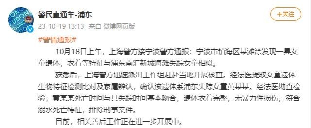 央視網(wǎng)消息:據(jù)@警民直通車-浦東 消息,10月18日上午,上海警方接寧波警方通報:寧波市鎮(zhèn)海區(qū)某灘涂發(fā)現(xiàn)一具女童遺體,衣著等特征與浦東南匯新城海灘失蹤女童相似。