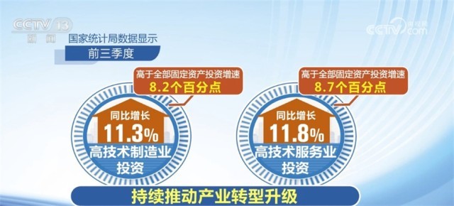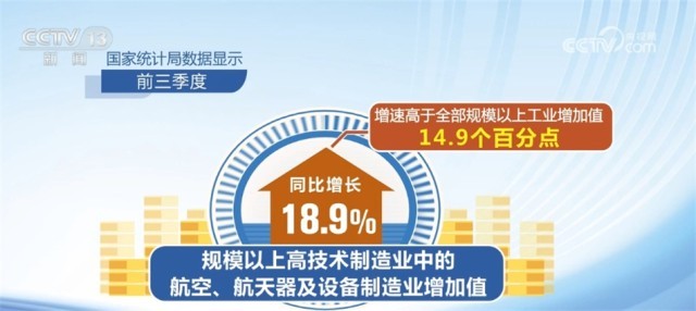 高技術產(chǎn)業(yè)投資動力強勁,新動能領域保持較快增長。國家統(tǒng)計局數(shù)據(jù)顯示,前三季度,高技術制造業(yè)投資和高技術服務業(yè)投資分別同比增長11.3%和11.8%,分別高于全部固定資產(chǎn)投資增速8.2和8.7個百分點,持續(xù)推動產(chǎn)業(yè)轉(zhuǎn)型升級。規(guī)模以上高技術制造業(yè)中的航空、航天器及設備制造業(yè)增加值同比增長18.9%,增速高于全部規(guī)模以上工業(yè)增加值14.9個百分點。