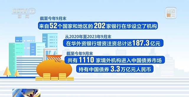金融開放步伐加快。截至今年9月末,來自52個國家和地區(qū)的202家銀行在華設立了機構;從2020年至2023年9月末,在華外資銀行增資注資總計達187.3億元。截至今年9月末,共有1110家境外機構進入中國債券市場,持有中國債券3.3萬億元人民幣。