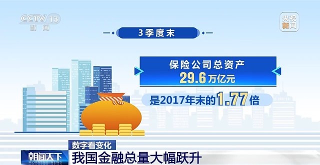 保險方面,3季度末,保險公司總資產29.6萬億元,是2017年末的1.77倍。從2018年到今年3季度末,保險公司賠款與給付累計支出8.4萬億元,保險的保障功能日益突出。