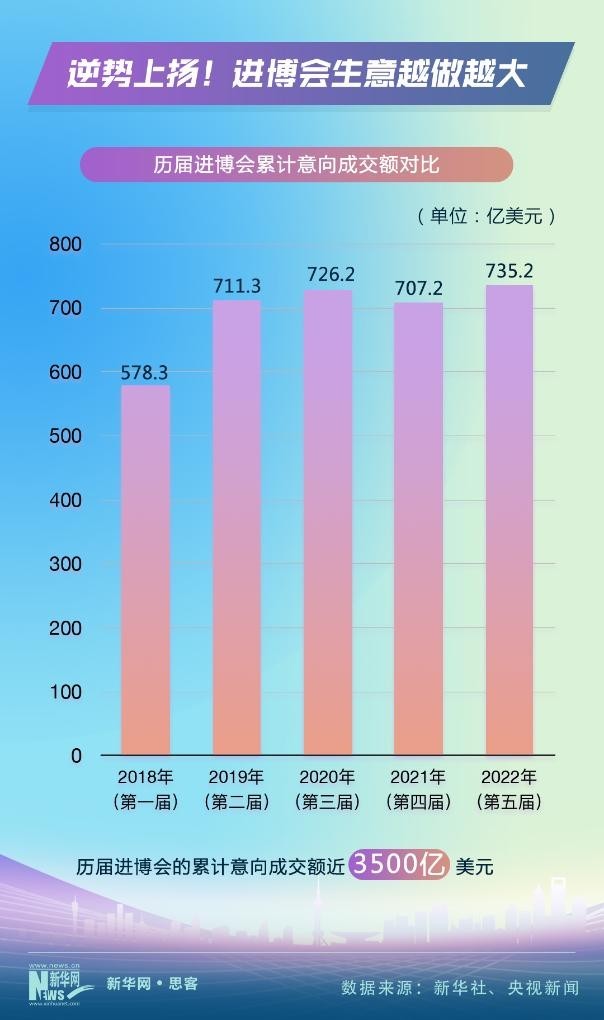 2018年11月,首屆進博會在上?!俺踉囂渎暋薄V?,進博會不顧風(fēng)雨和險阻,年年如約而至、越辦越好。數(shù)據(jù)顯示,進博會的累計意向成交額從2018年的578.3億美元,上升到2022年的735.2億美元。前五屆進博會的累計意向成交額近3500億美元。進博會生意越做越大。