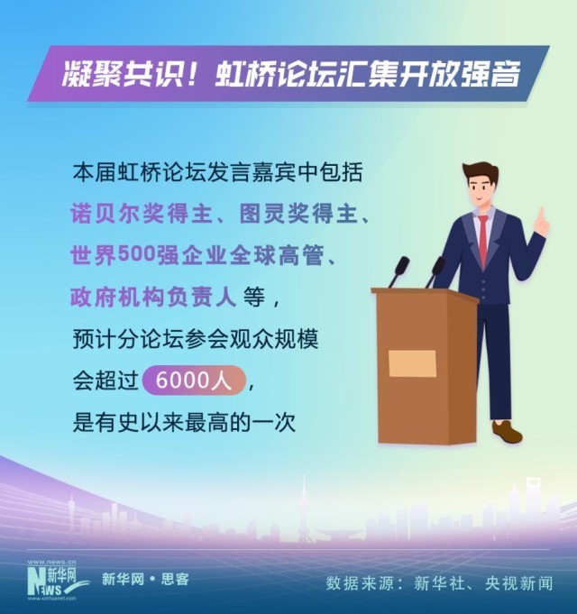 虹橋國際經(jīng)濟論壇是中國國際進口博覽會的重要組成部分。隨著進博會的“朋友圈”越來越大,虹橋論壇的影響力也不斷提升。今年的論壇以“攜手促發(fā)展,開放贏未來”為主題,發(fā)言嘉賓中包括了諾貝爾獎得主、圖靈獎得主、世界500強企業(yè)全球高管、政府機構(gòu)負(fù)責(zé)人等等,預(yù)計分論壇參會觀眾規(guī)模也會超過6000人,是有史以來最高的一次。