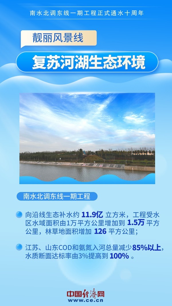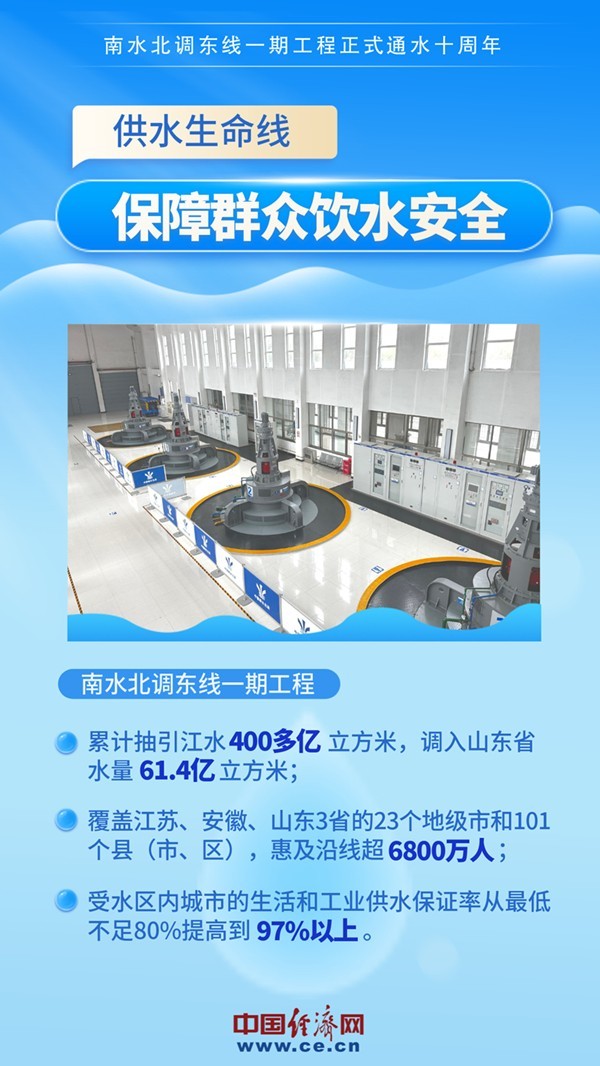 10年來,長江水、淮河水、黃河水等水系構(gòu)筑起的縱橫水網(wǎng),由一渠清水串連,鋪陳在東方大地上,連接起江蘇、安徽、山東3省的23個(gè)地級市和其轄內(nèi)的101個(gè)縣(市、區(qū))用水需求,惠及沿線超6800萬人。