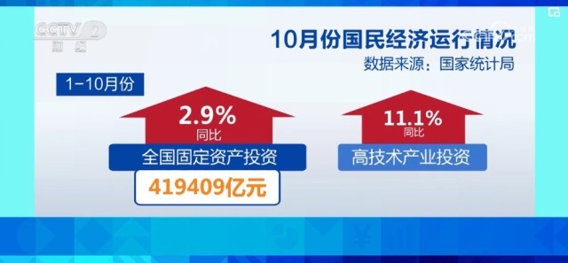 從投資來看,固定資產(chǎn)投資規(guī)模繼續(xù)擴(kuò)大。1—10月份,全國(guó)固定資產(chǎn)投資419409億元,同比增長(zhǎng)2.9%。其中,高技術(shù)產(chǎn)業(yè)投資同比增長(zhǎng)11.1%,增長(zhǎng)較快。