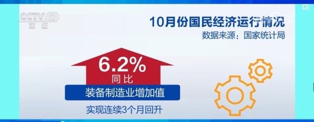 10月份,全國(guó)規(guī)模以上工業(yè)增加值比上月加快0.1個(gè)百分點(diǎn)。其中,裝備制造業(yè)增加值同比增長(zhǎng)6.2%,比上月加快0.7個(gè)百分點(diǎn),連續(xù)3個(gè)月回升。