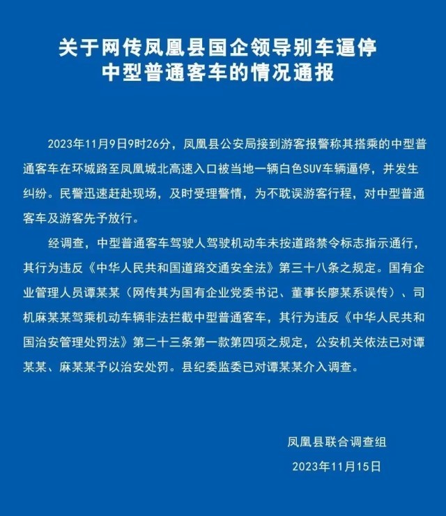 央視網(wǎng)消息:據(jù)鳳凰融媒微信公眾號消息,11月15日,鳳凰縣聯(lián)合調(diào)查組發(fā)布情況通報,經(jīng)調(diào)查,中型普通客車駕駛?cè)笋{駛機(jī)動車未按道路禁令標(biāo)志指示通行,其行為違反相關(guān)規(guī)定。國有企業(yè)管理人員譚某某 (網(wǎng)傳其為國有企業(yè)黨委書記、董事長廖某系誤傳)、司機(jī)麻某某駕乘機(jī)動車輛非法攔截中型普通客車,其行為違反相關(guān)規(guī)定,公安機(jī)關(guān)依法已對譚某某、麻某某予以治安處罰??h紀(jì)委監(jiān)委已對譚某某介入調(diào)查。