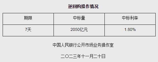 中新網(wǎng)11月20日電 據(jù)央行網(wǎng)站消息,為維護(hù)銀行體系流動性合理充裕,2023年11月20日人民銀行以利率招標(biāo)方式開展了2050億元逆回購操作,中標(biāo)利率1.80%,期限為7天。具體情況如下:
