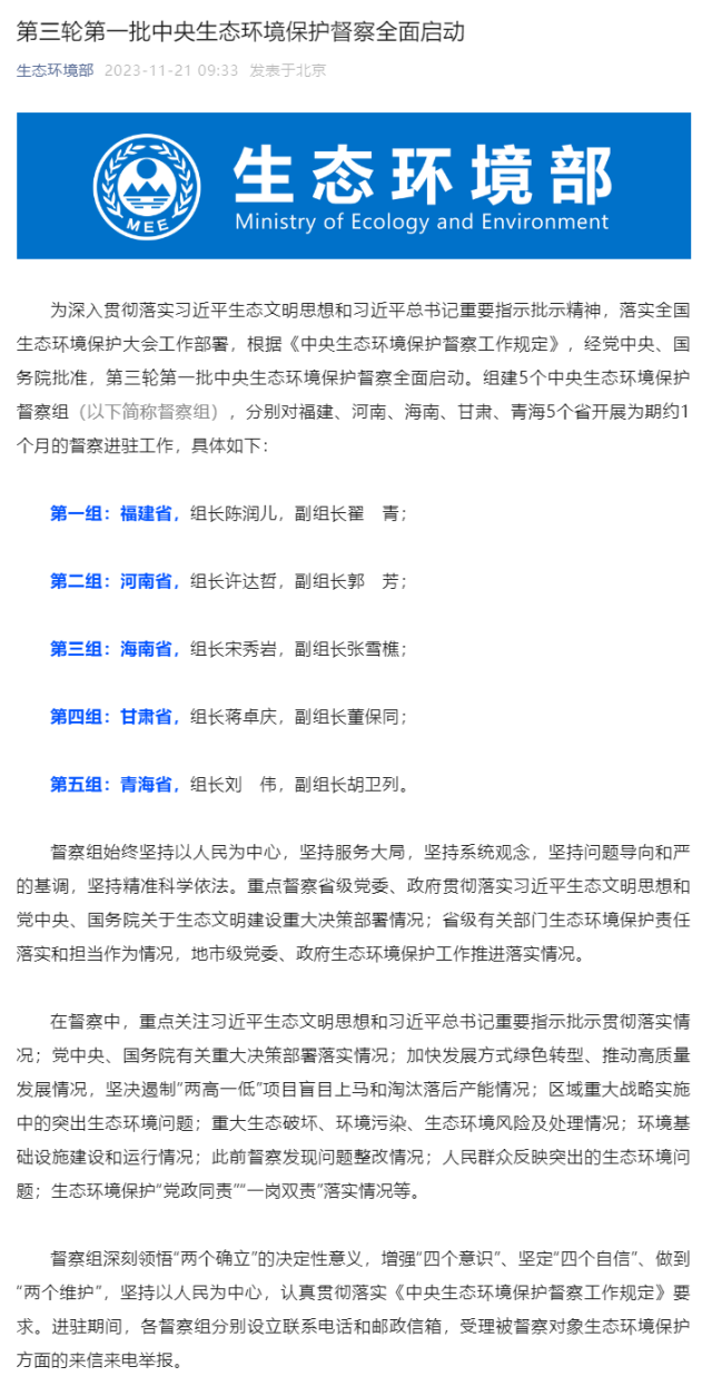 央視網消息:據生態(tài)環(huán)境部消息,為深入貫徹落實習近平生態(tài)文明思想和習近平總書記重要指示批示精神,落實全國生態(tài)環(huán)境保護大會工作部署,根據《中央生態(tài)環(huán)境保護督察工作規(guī)定》,經黨中央、國務院批準,第三輪第一批中央生態(tài)環(huán)境保護督察全面啟動。組建5個中央生態(tài)環(huán)境保護督察組(以下簡稱督察組),分別對福建、河南、海南、甘肅、青海5個省開展為期約1個月的督察進駐工作,具體如下: