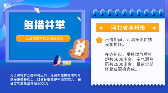 圍繞讓群眾安全溫暖過冬,北京門頭溝、房山、昌平等受災(zāi)較重的區(qū)集中開展專項(xiàng)行動(dòng),成立工作組,已完成農(nóng)房修繕約1萬宅,搶修重建35座鍋爐房、67座熱力站,3.8萬戶“煤改清潔能源”受損設(shè)施供電能力已全部恢復(fù)。