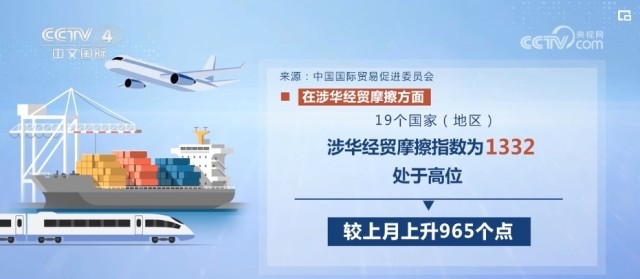 在涉華經(jīng)貿(mào)摩擦方面,19個國家(地區(qū))涉華經(jīng)貿(mào)摩擦指數(shù)為1332,處于高位,較上月上升965個點。