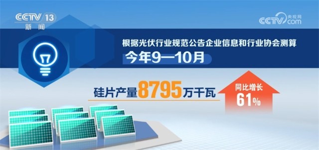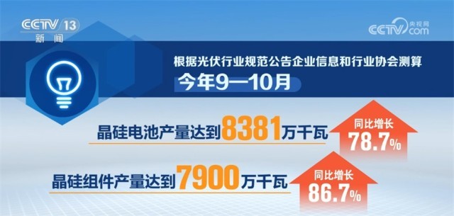 央視網消息:工業(yè)和信息化部昨天(12月13日)發(fā)布當前全國光伏制造行業(yè)最新運行情況。數據顯示,今年9—10月,我國光伏制造業(yè)保持高位運行,硅料、硅片、電池、組件產量同比增長均超60%。