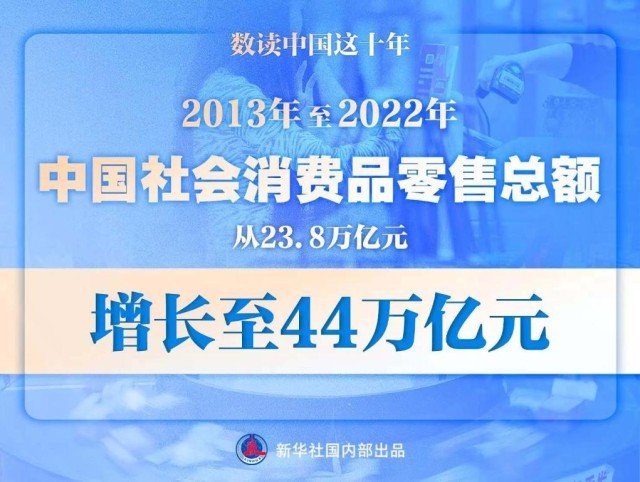 2013年至2022年10年間,中國社會消費(fèi)品零售總額從23.8萬億元增長至44萬億元,穩(wěn)居全球第二大消費(fèi)市場、第一大網(wǎng)絡(luò)零售市場和全球第二大進(jìn)口市場。消費(fèi)“主引擎”動力強(qiáng)勁,為推動高質(zhì)量發(fā)展、創(chuàng)造高品質(zhì)生活、構(gòu)建新發(fā)展格局提供有力支撐。
