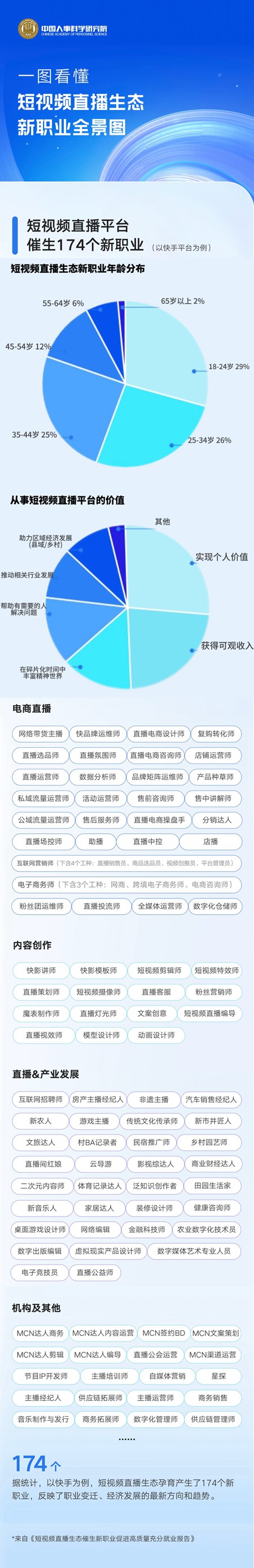 中國人事科學(xué)研究院近期發(fā)布的《短視頻直播生態(tài)催生新職業(yè)促進高質(zhì)量充分就業(yè)報告》顯示,一塊屏幕背后發(fā)生了諸多變化:中青年成短視頻直播生態(tài)新職業(yè)的主力軍。其中,18-24歲占29%,25-34歲占26%,35-44歲占25%。18-34歲占比達到55%?!吨腥A人民共和國職業(yè)分類大典(2022年版)》的1639個職業(yè)中,短視頻平臺快手覆蓋八成以上的數(shù)字職業(yè),為勞動者提供了更廣闊的職業(yè)發(fā)展空間。
