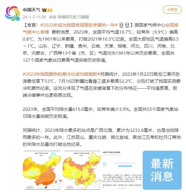 央視網(wǎng)消息:中國天氣 援引國家氣候中心國家氣候中心官博 最新消息,2023年,全國平均氣溫10.7℃,較常年(9.9℃)偏高0.8℃,為1961年以來最高,打破2021年10.5℃記錄。全國大部地區(qū)氣溫偏高0.5~1℃。山東、遼寧、新疆、貴州、云南、天津、湖南、河北、四川、河南、北京、內(nèi)蒙古、廣西等13個?。ㄊ小^(qū))氣溫均為1961年以來歷史最高,全國共127個國家氣象站日最高氣溫突破歷史極值。